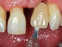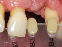 Feita a impressão e realizado o modelo de trabalho conclui-se que a inclinação do implante não permitia realizar uma prótese com fixação aparafusada Assim foi feito um coto individualizado fundido com o interface protético colocado 1 mm infra gengival, para facilitar a remoção do cimento. O colo do coto foi realizado com o desejado perfil de emergência bem como com o polimento adequado. O coto implantar foi provado em boca verificando-se, o seu ajuste, se o perfil de emergência era o adequado e se a linha de acabamento cervical estava 1 mm infra gengival. Nessa consulta foi feito um levantamento de cor dos tecidos gengivais, radiculares e coronários utilizando guias de cor adequadas. A cerâmica foi colocada procurando mimetizar a gengiva em falta e o componente radicular e coronário dos dentes adjacentes. Apesar de pouco convencional, esta reabilitação foi bem aceite pelo paciente, foi simples de realizar e mostrou-se esteticamente satisfatória e estável no tempo.