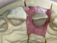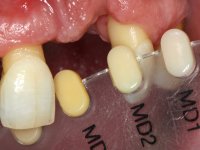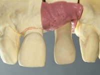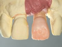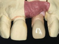 O componente protético deveria incorporar uma parte cerâmica que mimetiza-se a coroa e raiz dos dentes adjacentes, bem como uma parte cerâmica que mimetiza-se a gengiva que falta na deformidade vertical.