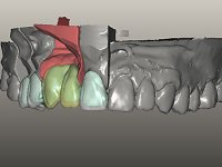 Foi realizado de imediato o tratamento endodôntico radical do dente 1.1,entretanto, foi realizada uma TAC para avaliação do património ósseo remanescente na zona da fenda. O remanescente ósseo mostrou-se muito reduzido em termos verticais e horizontais. A dificuldade de regenerar o património ósseo, bem como a dificuldade em ter tecidos moles para recobrir o enxerto, condicionou a nossa opção. Assim, foi planeada a realização de uma ponte com infra-estrutura em zircónio, revestida a cerâmica, com os dente 1.4/1.3 e 1.1 como pilares e com a colocação de dois dentes pônticos na zona edentula. A ponte incluiria um componente de cerâmica de tonalidade gengival para reabilitar os tecidos moles ausentes.