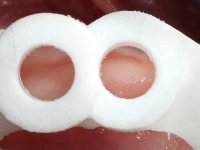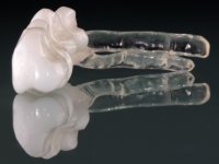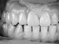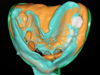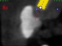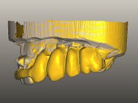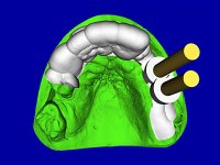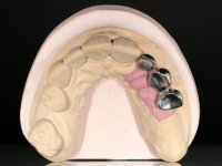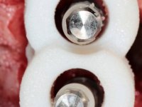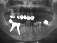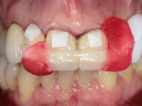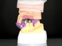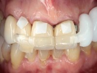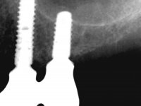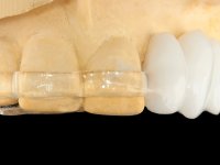 O estudo imagiológico para a colocação dos implantes, começou com a realização em laboratório de uma guia com dentes em sulfato de bário. Esta guia foi colocada em boca conjuntamente com marcas de referência coladas aos dentes, também em sulfato de bário. A guia foi estabilizada com cera mole. A TAC foi realizada com estas referências colocadas em boca. Após a realização da TAC foi feita uma impressão de arrasto em silicone. Esta impressão foi vazada a gesso em laboratório e posteriormente digitalizada. A digitalização do modelo com as referências foi sobreposta á imagem da TAC, permitindo uma planificação apurada na colocação dos implantes. Na planificação foi decidido colocar 2 implantes no local dos dentes 2.3 e 2.4 evitando-se a zona do 2.2 com pouco osso e o seio maxilar. Este estudo deu origem a uma guia cirúrgica que orientou a colocação dos implantes. Durante o período de osteo-integração a paciente utilizou a prótese removível rebasada com acondicionador de tecidos. A guia cirúrgica mostrou-se também útil na exposição dos implantes mostrando a sua localização precisa e orientando a incisão. A impressão definitiva foi realizada utilizando a técnica de moldeira aberta após eliminação do attachment. No laboratório foi confeccionada uma ponte metalo-cerâmica de 3 elementos com o elemento 2.2 em suspensão. A ponte após verificação e aprovação foi cimentada. A reabilitação apesar de pouco extensa (sem o elemento 2.6) mostrou-se capaz estetica e funcionalmente.