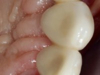 Paciente do sexo feminino, com 69 anos, não fumadora. Apresenta uma prótese combinada no maxilar superior. A porção fixa corresponde a uma ponte metalo-cerâmica de 4 elementos com os dentes 1.3/1.1 e 2.1 como pilares e o dente 1.2 como pôntico. A porção amovível corresponde a uma prótese esquelética de 5 elementos. A retenção da prótese esquelética é feita por um gancho no dente 1.4 e um “attachment tipo t” colocado no dente 2.1.