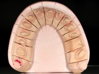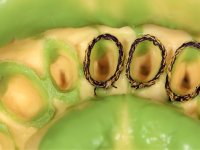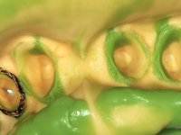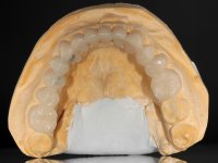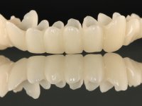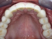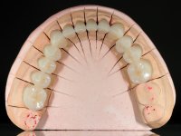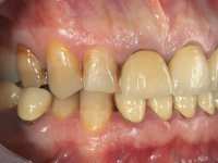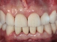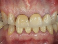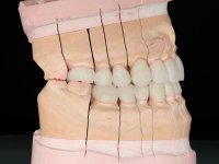 A primeira acção terapêutica foi tentar melhorar o tratamento endodôntico dos dentes (2.4/2.5/4.2)). A sua manutenção em boca seria condicionada pelo sucesso desta intervenção. Seguidamente foram feitas impressões em alginato e registo inter-maxilar em silicone para confeção em laboratório de uma ponte provisória em acrílico com reforço. O objetivo desta ponte provisória seria ensaiar o aumento da D.V.O. e descruzar a mordida do lado direito. Foi utilizado um monobloco de 13 dentes com o dente 2.6 com o pôntico. As coroas e as pontes foram removidas e os remanescentes coronários foram repreparados. A ponte provisória foi rebasada primeiramente com acrílico auto-polimerizável e de seguida com resina composta. Após 2 semanas de permanência em boca, foram feitas as impressões para confeção da ponte provisória inferior também realizada em laboratório. Especial cuidado foi colocado na remoção das coroas antigas, sendo feito primeiramente um corte axial que permitiu que fossem removidas de uma forma menos traumática. A temporização foi feita durante 8 semanas, permitindo que os tecidos gengivais estabilizassem posicionalmente. As impressões definitivas foram realizadas após afastamento gengival utilizando a técnica do fio único impregnado. Foi utilizada a técnica de dupla mistura com dupla viscosidade (putty soft e light).Simultaneamente foi realizada a recolha das relações inter-maxilares e o registo com arco facial. Foram confecçionados os modelos de trabalho e feita a sua correta montagem em articulador semi-ajustável. Em seguida foram feitas infra estruturas em zircónia que posteriormente foram revestidas por cerâmica. A prova de “biscoito” foi realizada em boca para avaliação estética e funcional sendo também avaliado o seu assentamento e ajuste. A reabilitação definitiva foi cimentada em boca utilizando um cimento de ionómero de vidro reforçado por resina.