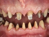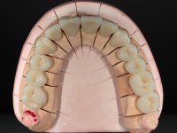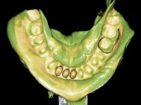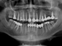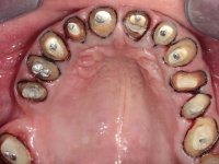 Paciente do sexo masculino, com 42 anos de idade, não fumador. Apresentava uma reabilitação metalo -cerâmica feita há mais de 10 anos com exposições radiculares e infiltrações. No maxilar superior apresentava uma coroa no 1.1,uma ponte de dois elementos no 2.1 e 2.2.e uma ponte de 4 elementos nos dentes 2.4,2.5,2.6 e 2.7 com o 2.6 como pôntico. Os dentes 1.6/1.5/1.4/1.3/1.2/1.1/2.1/2.2/2.3/2.4/2.5 e 2.7 apresentam tratamento endodôntico radical com o 2.4/2.5 e 2.7 a necessitarem de ser refeitos. No maxilar inferior apresentava uma ponte metalo-cerâmica de 4 elementos nos 4 incisivos e uma ponte de 3 elementos (3.3 e 3.4) com um dente supranumerário como pôntico. Os dentes 4.6/4.5 e 4.2 apresentavam tratamento endodôntico com o 4.2 a necessitar de ser refeito. Os dentes 4.3 e 4.4 apresentavam extensas cáries linguais com algum comprometimento mesial. As peças protéticas apresentavam-se infiltradas com exposição radicular associada. Apresentava uma D.V.O. diminuída e uma mordida cruzada lado direito. O paciente tinha uma satisfatória saúde periodontal e uma boa higiene oral.