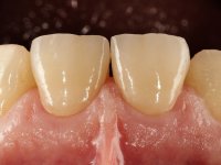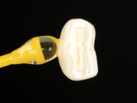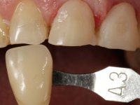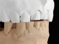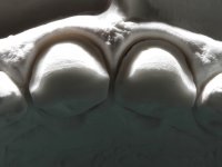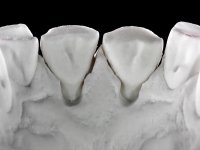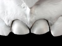 A primeira ação que realizamos foi um “Mock-up” direto em boca com resina composta sem adesão. Assim foi avaliada em conjunto com o paciente a vantagem estética de aumentar a altura dos incisivos centrais superiores. Aceite a proposta, foi feita uma pré-impressão em silicone para a confeção das facetas provisórias. Colocado um fio de afastamento gengival, foi realizado o preparo dentário. Essa preparação teve particular atenção ao facto da inserção das duas facetas ser frontal. Nesse sentido as paredes mesiais e distais não necessitaram de convergência. O bordo incisal foi preparado perpendicular ao eixo de inserção. Após o preparo, foi feito o IDS (imediate dentin sealing). A impressão foi feita com técnica de dupla mistura com silicone “Putty soft” e silicone “Light”. As facetas provisórias foram feitas com resina composta de polimerização ”dual”. Na mesma sessão foi feita a escolha da cor. Em laboratório foram confecionadas duas facetas de cerâmica feldespática com eixo de inserção frontal. Foi utilizado um modelo de trabalho “tipo Geller”.Na clinica, após a colocação do dique de borracha “rubber dam”, foram coladas as facetas. Após a colagem foi feita uma cuidadosa avaliação da oclusão, principalmente na protusão. A recuperação da dominância dos incisivos centrais foi esteticamente apreciada pelo paciente.