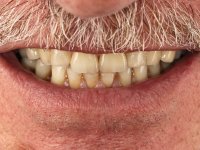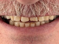 O paciente apresentava os incisivos centrais superiores com restaurações de resina composta que fraturavam com frequência. O paciente também não gostava do “aspeto envelhecido” dos seus dentes.