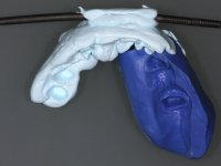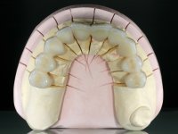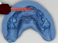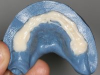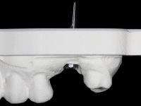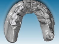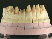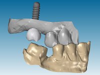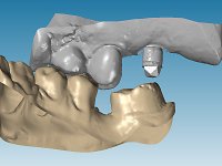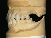 Feitas as impressões iniciais, os modelos de estudo montados em articulador semi-ajustável, deram origem a um enceramento de diagnóstico. Este enceramento procurou simular a reabilitação desejada. Foi tentada desta forma a correcçaõ da Classe III. Baseado neste enceramento foi feita uma chave de silicone “Putty” que serviria para realizar o “ Mock-up”. O “ Mock-up” foi realizado com resina composta de polimerização “dual”, após a remoção dos excessos, acabamentos e polimento, a paciente avaliou o impacto estético da reabilitação proposta. Esta proposta foi aceite pela paciente com muito agrado. Assim foi realizada no laboratório a ponte provisória em acrílico auto-polimerizável com inclusão de um reforço. A ponte provisória consistiu num monobloco de 10 elementos. Após a preparação dentária a provisória foi rebasada em boca, primeiro com acrílico auto-polimerizável e em seguida com resina composta. Após 8 semanas em boca, para aprovação estética e funcional e acondicionamento dos tecidos moles, a ponte provisória foi removida e feita a impressão definitiva. Foi utilizada a técnica de dupla impressão com tripla viscosidade. Em laboratório a impressão deu origem a uma modelo de trabalho que foi “scaneado”. A “scanerização” do modelo encerado foi sobreposta á scanerização do modelo de trabalho para que as infra-estruturas realizadas por técnica de CAD-CAM fossem realizadas em coerência com a situação proposta inicialmente. Obtiveram-se 2 peças em Zr, uma com 4 elementos e outra com 6 elementos. Estas infra–estruturas foram testadas e aprovadas clinicamente. Regressadas ao laboratório, estas estruturas, de acordo com o enceramento inicial foram revestidas a cerâmica voltando á clinica para serem colocadas definitivamente. Um mês após a colocação do trabalho foram colocados dois implantes, um no local do dente 1.6 e outro no local do dente 2.6. Com dois meses de osteointegração foi feita a “scanerização” dos implantes, diretamente em boca. Esta “scanerização” deu origem a duas coroas aparafusadas sobre os implantes seguindo um “work flow” completamente virtual. Finalmente as coroas foram colocadas em boca terminando a reabilitação do maxilar superior da paciente.