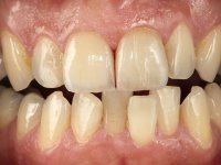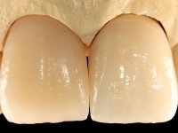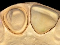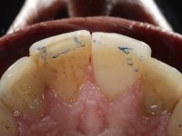 Paciente de 38 anos, sexo masculino, não fumador. Apresentava os dois incisivos centrais superiores com extensas restaurações em resina. O dente 1.2 apresentava uma restauração classe IV, o dente 1.1 apresentava toda a superfície coronária revestida por resina e o dente 2.1 tinha uma restauração classe III. Era notória uma assimetria na morfologia e na dimensão dos centrais. Os dentes apresentavam-se vitais. Paciente com boa saúde gengival e bons hábitos de higiene.