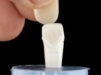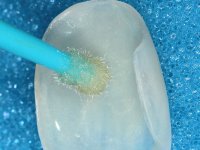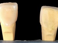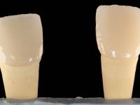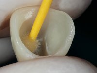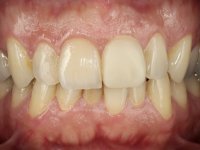 Foi feito o preparo dentário do dente 1.1 para a colocação de uma coroa total feldespática. O preparo consistiu na remoção da resina composta e confeção de uma linha de acabamento cervical em chanfro. No dente 2.1, praticamente não foi feito qualquer preparo dentário, sendo apenas criada alguma rugosidade na superfície vestibular e inter-proximal mesial. Após o preparo dentário, foi feita uma impressão por técnica de dupla mistura, que deu origem a um modelo de trabalho “Tipo Geller”. A coroa e a faceta foram confecionadas e posteriormente coladas em boca. A colagem iniciou-se pela coroa utilizando-se um isolamento relativo. Após a colagem da coroa foi feita a colocação do dique de borracha para colagem da faceta. Após dois anos o paciente sofreu um traumatismo, no qual fraturou a faceta colocada no dente 2.1. No sentido de resolver a situação foi feito um preparo dentário no dente 2.1 para colocação de uma faceta feldespática de inserção vertical. Previamente foi realizada uma chave de silicone para orientar a confeção da nova faceta. Esta nova faceta foi colada em boca após colocação do isolamento absoluto. Apesar do acidente sofrido, o paciente conseguiu resolver o problema dentro das soluções minimamente invasivas.
