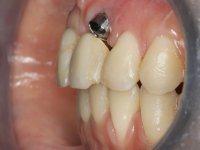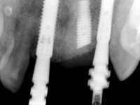 Paciente do sexo feminino, com 30 anos de idade, não fumadora. A paciente surge na consulta após tratamento ortodôntico e colocação de um implante no local do dente 2.1. Apresentava os dentes 3.7, 3.6 e 4.7 com tratamento endodôntico e os dentes 1.5, 2.5, 2.6 e 4.5 com restaurações extensas. Apresentava um periodonto fino e mostrava uma higiene oral satisfatória. Após exposição cirúrgica do implante este mostrou-se posicionado de forma inadequada. A reabilitação protética do implante mostrou-se impossível adotando critérios estéticos aceitáveis. A paciente durante 6 anos andou com uma coroa provisória de acrílico sobre um coto aparafusado como solução de recurso já que não aceitou a proposta de remover o implante. Após este tempo surge na consulta com um abcesso no dente 1.1. Analisada a situação constatou-se que os dentes 1.1 e 2.2 tinham extração indicada e o implante deveria ser removido ou submergido.