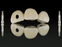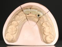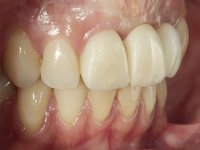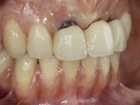 A exposição cirúrgica do implante e a colocação do parafuso de cicatrização mostrou-se uma surpresa negativa no que diz respeito à sua posição. Rejeitada a proposta de remoção do implante, avançamos para a sua reabilitação provisória. Foi feita a impressão por técnica de moldeira aberta e em laboratório foi confecionado um coto aparafusado com componente gengival e coronário e uma coroa em acrílico também com estes dois componentes. A coroa provisória foi colocada em boca até ser tomada uma decisão definitiva. Passaram 6 anos até que a paciente retorna à consulta com um abcesso no dente 1.1. Tomada a decisão de extrair os dentes 1.1 e 2.2 foi feita uma impressão para confecionar uma ponte provisória de 3 elementos com uma rede para ser aderida aos dentes adjacentes. A cirurgia foi planificada e realizada, colocando-se os dois implantes no local do 1.1 e 2.2 e o implante no local do 2.1 foi cortado com o objetivo de o submergir, simultaneamente foi feita a regeneração tecidular adequada (Trabalho Cirúrgico realizado por Dr. Manuel Neves). Durante a osteointegração a paciente utilizou a ponte provisória fixa. Foi realizada primeira impressão para a confeção de uma ponte provisória aparafusada em Zr que trabalhou durante 12 semanas os tecidos moles. A impressão definitiva foi feita com a individualização dos transferes. A reabilitação definitiva foi feita com cotos ceramizados e com uma ponte de infraestrutura em Zr revestida por cerâmica. Em virtude da inclinação do implante colocado no local do dente 1.1 a ponte exigiu fixação cimentada.
