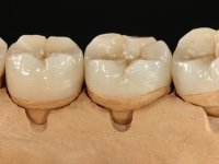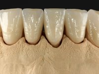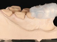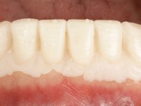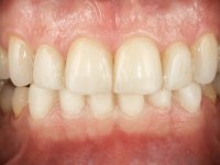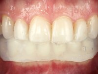 Realizado o diagnóstico e tomada a decisão quanto ao tratamento a executar, tornou-se importante definir qual a sequência de trabalho a adotar no sentido de conseguir a reabilitação da D.V.O. (V.D.O), de forma progressiva e equilibrada. Na primeira fase fez-se uma pré-impressão da arcada inferior com silicone tipo “putty” e em seguida realizou-se o preparo dentário de todo o sector posterior. O preparo para os overlays foi feito coronalmente à linha amelo cementaria no sentido de ser o mais conservador possível. A impressão foi feita com técnica de dupla mistura após afastamento gengival realizado com pasta de caulino. A provisória foi realizada com resina composta de polimerização dual. Em laboratório foram realizados os overlays após se ter aberto ligeiramente (1,5mm) a D.V.O. nos modelos montados em articulador semi-ajustável. Simultaneamente o sector antero-inferior foi encerado no sentido de acompanhar este aumento da D.V.O. Também foi confecionada uma chave de silicone translucido para posterior confeção dos provisórios antero-inferiores. Em boca foi primeiro realizada a provisionalização dos dentes anteriores utilizando resina composta previamente aquecida após preparação das superfícies dentárias para a adesão. Foi colocado o dique de borracha para promover o isolamento absoluto e posteriormente foram colados os overlays. Em laboratório foi realizada nova chave de silicone para confecionar os provisórios antero-superiores. Seguidamente em boca foram preparados os seis dentes antero-superiores após colocação do fio de afastamento gengival. Feita a preparação adequada das superfícies dentárias foi realizada a impressão com técnica de dupla mistura e a respetiva provisória. Em laboratório foram confecionadas 6 facetas feldespáticas num modelo de trabalho tipo “Geller”. A provisória foi removida e as facetas foram coladas em boca utilizando um isolamento relativo competente. Esta opção foi tomada em virtude de uma prévia experiencia negativa com a colocação do dique de borracha na mandibula. Após a colagem dos laminados antero-superiores foram dadas 12 semanas para avaliar a adaptação do paciente à nova situação e então iniciar a confeção das facetas antero-inferiores. Após colocação do fio de afastamento gengival. foram feitos os preparos dentários adequados e em seguida foi feita a impressão. Também foi feita a preparação do dente 3.4 que, entretanto, tinha sofrido uma fratura do overlay. As facetas e a restauração do 3.4 foram realizadas num modelo de trabalho tipo “Geller”. Após remoção da provisória, as facetas foram coladas em boca, utilizando um isolamento relativo pelas razões apontadas anteriormente. Após colocação do trabalho o paciente foi reabilitado por outros colegas com um implante na zona do 2.6 e substituição da coroa aparafusada sobre o implante colocado no local do 3.5. Posteriormente surgiram fraturas nos overlays dos dentes 4.7 e 3.7 que foram reabilitados com overlays em Zr.