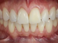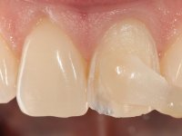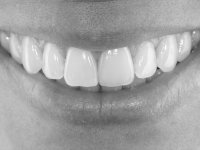 Paciente do sexo feminino com 36 anos de idade, não fumadora. Apresentava o dente 2.1 com tratamento endodôntico, e uma alteração cromática na superfície vestibular. A mancha de tonalidade amarelada parecia resultar de uma alteração do esmalte em profundidade. O dente 1.1 apresentava uma ligeira retração gengiva. Boa higiene e saúde periodontal.