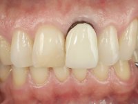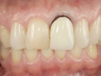 Removida a coroa metalo-cerâmica do dente 2.1, foi realizado o re-preparo do coto dentário, colocando a linha de acabamento cervical intrasulcular. No dente 1.1 foi realizado o preparo para uma faceta de inserção vertical. Colocados os fios de afastamento gengival, foi feita a hibridização da dentina. A impressão foi realizada com a técnica de dupla mistura e a ponte provisória colocada. No laboratório o trabalho foi realizado num modelo Tipo Geller. Uma faceta feldespática no dente 1.1 e uma coroa com infraestrutura em Zr revestida a cerâmica. Após a realização do isolamento absoluto com a colocação do dique de borracha, foi feita a colagem da faceta. Depois da colagem da faceta, foi removido o dique e foi feito um isolamento relativo com Teflon para colagem da coroa.