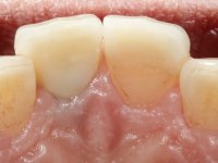 Paciente do sexo masculino, com 52 anos de idade e não fumador. Apresenta o dente 2.1 com tratamento endodôntico e uma coroa metalo-cerâmica com mais de 20 anos retida por um poste intra-radicular. A coroa apresenta infiltração cervical e uma exposição radicular com 2mm. O dente 1.1 apresenta uma extensa restauração a resina composta com infiltração. Apresenta uma boa saúde periodontontal e é portador de uma prótese removível inferior.