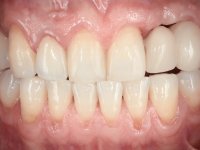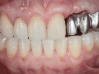 Feito o diagnóstico foi confecionada em laboratório uma ponte provisória em acrílico com reforço. A ponte de 3 elementos utilizaria o dente 2.4 como pilar, teria os dentes 2.3 e 2.2 como pônticos e seria apoiada por palatino do dente 1.1. Após a remoção da ponte sobre o implante, o dente 2.4 foi preparado e a ponte rebasada em boca com acrílico. Antes da colocação da ponte provisória foi feita uma impressão para a confeção de uma guia imagiológica. Na sessão seguinte, foi realizada uma TAC com a guia imagiológica. A planificação virtual da colocação do implante no local do dente 2.2 deu origem a uma guia cirúrgica. A colocação do implante foi feita com a técnica de cirurgia guiada, complementada com uma regeneração óssea guiada. O implante fraturado, foi cortado com o objetivo de o submergir. Durante 3 meses foi feita a osteointegração do implante bem como a maturação completa dos tecidos duros e moles. Durante este período a paciente utilizou uma ponte provisória fixa. A impressão do implante e do dente preparado foi feita utilizando a técnica de moldeira aberta. O modelo de trabalho foi realizado com gengiva artificial e sobre este foi confecionada uma infraestrutura metálica de 3 elementos a ser cimentada no dente 2.4 e aparafusada sobre o implante colocado no local do dente 2.2. A prova da infraestrutura foi feita, fazendo-se a validação clínica e imagiológica. Nesta consulta foi confirmada a intenção de utilizar cerâmica coronária e gengival. Nesse sentido, foi escolhida a cor utilizando guias de cor individualizadas. Tendo a infraestrutura colocada em boca, realizei novo registo intermaxilar com silicone, para confirmar o anterior registo. Foi colocada cerâmica coronária e gengival recobrindo a infraestrutura e com o trabalho finalizado, antes da sua colocação, foi novamente verificada a sua integração em boca. A fixação em boca foi feita com cimentação sobre o dente 2.4 e aparafusada sobre o implante. Finalmente, foi avaliada rigorosamente a sua integração oclusal.