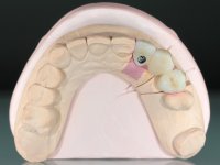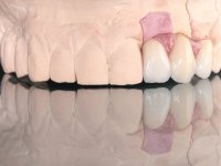 Após avaliação clínica e imagiológica, foi decidido não retirar o implante fraturado, mas submergir o implante. A explantação do implante provocaria uma deformidade difícil de reabilitar. Assim, foi decidido colocar um implante no local do dente 2.2 e posteriormente fazer a reabilitação com uma ponte metalo-cerâmica de 3 elementos. A planificação virtual da colocação do implante, bem como a confeção de uma guia cirúrgica, seriam obrigatórias para o seu correto posicionamento. Uma ponte com cerâmica de tonalidade coronária a gengival seria aparafusada ao implante e cimentada no dente 2.4, com o 2.3 como pôntico. A temporização seria feita com uma ponte provisória de 3 elementos, cimentada ao dente 2.4 e aderida com um apoio metálico ao dente 2.1.
