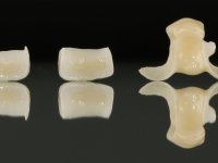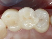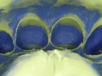 Após colocação do fio de afastamento gengival foi feita a preparação dentária dos incisivos centrais superiores para serem reabilitados com facetas. A Preparação dentária para a ponte Maryland consiste em paralelizar as paredes inter-proximais dos dentes adjacentes ao espaço edêntulo. A impressão dos preparos foi feita com uma técnica de dupla mistura com silicone de adição de consistência putty soft e regular. No laboratório foram confeccionadas duas facetas de cerâmica feldspática e uma ponte Maryland com infra-estrutura em Zr posteriormente revestida a cerâmica. Na superfície da infra-estrutura que vai contactar com a superfície dentária, foi aplicado um “liner” de cerâmica com o intuito de poder facilitar a colagem desta infra-estrutura ao esmalte dentário. A colagem em boca começou pela ponte tipo Maryland. Foi aplicado um isolamento relativo diferente do convencional usando teflon para o efeito. A colagem das facetas foi feita com isolamento absoluto de forma convencional. A paciente ficou agradada com o resultado obtido.