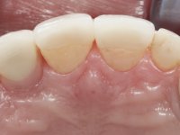 O tratamento iniciou-se com a re -preparação do coto do espigão falso coto fundido, com o objetivo de colocar as linhas de acabamento cervical com uma localização intra-sulcular e simultaneamente confecionar uma coroa provisória adaptada. Com um tratamento ortodôntico muito simples, fechou-se o diastema entre os incisivos centrais superiores e estabilizou-se esta posição com um arame colocado na superfície palatina dos centrais, funcionando como contenção. Posteriormente procurou-se fazer uma tração ortodôntica lenta do dente 2.2 com o intuito de diminuir, ainda que muito ligeiramente a perda óssea vertical nessa zona. Finalizada a tração, foi feita a extração do dente 2.2 e a zona foi reabilitada provisoriamente com uma coroa de resina composta colada aos dentes adjacentes. Foi colocado um implante dentário na zona do dente 2.2 sendo novamente colada a coroa provisória em resina, reabilitando provisoriamente a paciente durante o período de osseointegração. No dente 1.3 foi feita uma gengivectomia com bisturi elétrico, com a intenção de subir o nível cervical do 1.3 conseguindo uma maior harmonia com o dente 2.3. Estabilizados os tecidos moles, foi feita uma impressão com a técnica de moldeira aberta, utilizando silicones de adição de consistência “putty” e “light”. A recolha da cor, tanto da componente dentária como dos tecidos moles foi feita pelo ceramista no consultório. No laboratório as impressões foram passadas a gesso e deram origem a modelos de trabalho que foram devidamente analisados. Foi decidido confecionar um “abutment” metalo-cerâmico aparafusado sobre o implante. Este “abutment” foi fundido com uma liga nobre e posteriormente revestido a cerâmica coronária e gengival. Dada a inclinação do implante o aparafusamento condicionou de forma inevitável a saída do orifício do parafuso pela superfície vestibular. No sentido de esconder esta situação, o desenho do “abutment” já foi idealizado com a intenção de acomodar na superfície vestibular a colagem de uma faceta feldspática. Este “abutment” foi provado em boca e foram feitos ajustes no componente cerâmico gengival. A sua adaptação aos tecidos moles foi feita tanto de forma subtrativa, com broca, como de forma aditiva, acrescentando resina composta de tonalidade gengival. Este acrescento de resina seria orientador do ceramista na colocação final da cerâmica de tonalidade gengival. A coroa que reabilitaria o dente 1.3 foi cimentada nesta consulta de prova com cimento de ionómero de vidro reforçado com resina composta. Finalizado o trabalho em laboratório da faceta sobre o 1.2 e o “abutment” e a faceta para o implante este foi colado em boca, após a colocação do isolamento absoluto. O trabalho satisfez plenamente a paciente. Durante oito anos a paciente foi seguida regularmente, mostrando-se agradada com o tratamento efetuado, no entanto começou a mostrar interesse em intervir esteticamente nos incisivos centrais superiores. Decidida a segunda fase da nossa intervenção, foi feita a preparação dentária dos dentes 1.1 e 2.1 para a colocação de duas facetas feldspáticas. Particular cuidado foi tido na preparação inter-proximal distal junto ao “abutment” do implante. Foi preciso avaliar muito pormenorizadamente o eixo de inserção da faceta em relação ao “abutment”. As facetas feldspáticas foram confecionadas em laboratório e posteriormente coladas em boca após a colocação de isolamento absoluto. Um ano após, iniciamos a nossa terceira fase de tratamento, após a faceta colada no dente 2.1 ter fraturado. A preparação dentária foi feita sobre a faceta colada, procurando estender mais para palatino o interface inter-proximal distal. O objetivo seria passar para mais palatino do ponto de contacto o interface faceta-dente. O preparo dentário do dente 1.2 também foi muito reduzido, limitando-se a criar um eixo de inserção. Após confecionadas a coroa total e a faceta em laboratório foram coladas em boca. Primeiro foi colada a coroa utilizando-se um isolamento relativo com teflon, posteriormente foi colada a faceta após a colocação do isolamento absoluto. Na coroa utilizei este tipo de isolamento para evitar a utilização de grampos. Seria difícil de aplicar pela forma e dimensão do dente e agressivo para os tecidos moles. Após a colagem foi avaliada a integração oclusal do trabalho.