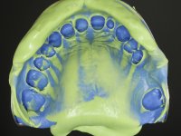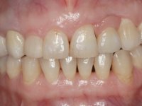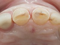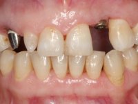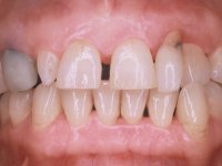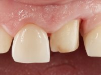 Paciente do sexo feminino, com 47 anos não fumadora. Apresentou-se na consulta com o dente 1.3 com tratamento endodôntico e com um espigão falso coto fundido, reabilitado com uma coroa provisória. Os dois incisivos laterais superiores são conoides e de reduzida dimensão. O dente 2.2 apresenta mobilidade, consentânea com uma significativa reabsorção óssea entre o dente 2.1 e o dente 2.3 Os dois incisivos centrais estão separados por um diastema de 3mm e o dente 2.3 apresenta uma oclusão cruzada com o dente antagonista. Verifica-se também a ausência de alguns dentes posteriores e uma higiene oral razoável. Na segunda intervenção realizada passados 8 anos, verificou-se que os incisivos centrais superiores se apresentavam cromaticamente mais escuros e apresentavam um sulco longitudinal no esmalte que estando pigmentado comprometia esteticamente o sorriso. O trabalho realizado na primeira fase do tratamento mostrava-se competente estética e funcionalmente. Por fim, um ano após a última intervenção, a paciente apresentou-se com uma fratura da faceta colocada no dente 2.1 provavelmente em resultado de estar em contacto com o coto do implante. A rigidez da anquilose implantar, pode ter sido a causa desta fratura. Outros casos deste tipo de fratura já foram observados por mim em situações clínicas idênticas. A faceta do dente 1.2 apresentava-se esteticamente comprometida e a própria estrutura dentária apresentava uma pequena cárie e, pelo que se recomendaria a sua substituição.