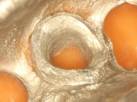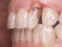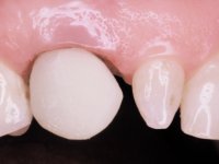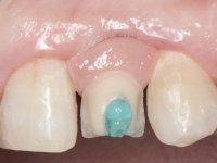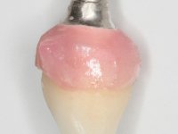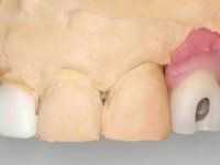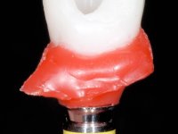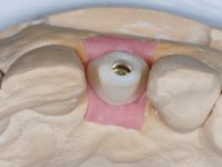 • Colocação de um Implante no local do dente 2.2. Reabilitação do implante com um “abutment” de componente coronário e gengival. em que o orifício de acesso ao parafuso fosse “camuflado” com uma faceta feldspática.