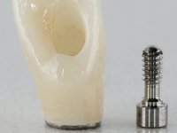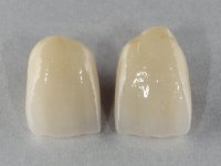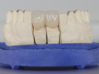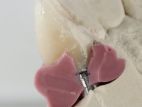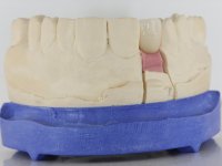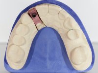 Sobre os implantes colocados no 4º quadrante foi proposta a reabilitação com uma ponte de 2 elementos aparafusada. No setor anterior foi proposta a substituição das coroas sobre os centrais bem como a substituição da coroa sobre o implante. No 2º quadrante optamos pela confeção de uma ponte de 3 elementos com os dentes 2.6 e 2.4 como pilares e o dente 2.5 como pôntico. Esta opção prevaleceu sobre a colocação de um implante no local do 2.5 porque os dentes 2.4 e 2.6 tinham tratamento endodôntico e não se apresentavam esteticamente satisfatórios.