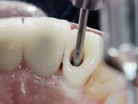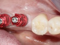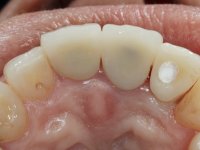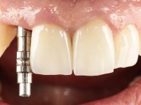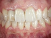 Paciente do sexo feminino, com 56 anos de idade, não fumadora. Os dentes 1.1 e 2.1 apresentavam-se com tratamento endodôntico e espigões falsos cotos fundidos. As coroas metalo-cerâmicas que os reabilitavam apresentavam as margens cervicais expostas e infiltradas. Tinha um implante colocado no local do dente 1.2 com uma coroa cimentada. No 4º quadrante estavam colocados dois implantes no local dos dentes 4.6 e 4.7, já com os parafusos de cicatrização colocados. No 2º quadrante os dentes 2.4 e 2.6 apresentavam tratamento endodôntico e o 2.6 tinha uma coroa metalo-cerâmica infiltrada. O periodonto apresentava-se genericamente saudável, com exceção da gengiva marginal junto das coroas infiltradas. Boa higiene oral.