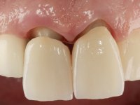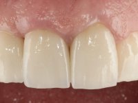 Decidimos começar pela reabilitação dos implantes do 4º quadrante fazendo uma impressão pela técnica de moldeira aberta, com silicone de duas viscosidades e presa rápida. No laboratório foi confecionada uma ponte aparafusada sobre implantes. Após verificação do correto ajuste em boca, foi apertada definitivamente em boca e os orifícios de acesso obturados. Na substituição das coroas dos incisivos centrais, começamos por fazer uma pré-impressão em silicone para confeção de uma ponte provisória. Em seguida as coroas antigas foram cortadas com turbina e removidas, os cotos dentários foram re-preparados e as linhas de acabamento cervical foram colocadas a nível intra-sulcular. Em seguida foi feita a impressão com uma técnica de dupla mistura com duas viscosidades. No laboratório foram confecionadas duas coroas com infraestrutura em Zr e revestidas a cerâmica. Após verificação em boca e aprovadas pela paciente foram cimentadas com cimento de ionómero de vidro reforçado com resina. Esperamos dois meses para que a arquitetura gengival do sector anterior estabilizasse e então foi iniciada a substituição da coroa sobre o implante. Sendo uma coroa cimentada, primeiro foi cortada com turbina e depois removida. O coto foi desaparafusado do implante e foi feita uma impressão pela técnica de moldeira aberta. Foi confeccionada em laboratório uma coroa aparafusada com a utilização de um parafuso dinâmico, que permitiu contornar a inclinação do implante. Após aprovação pela paciente, a coroa foi definitivamente apertada ao implante e o orifício de acesso obturado. Por último, a realização da ponte no 2º quadrante começou com a confeção de uma pré-impressão para a confeção de uma ponte provisória. A coroa do 2.6 foi removida e o coto re-preparado simultaneamente com o preparo do dente 2.4. Em seguida foi feita a impressão com técnica de dupla mistura com dupla viscosidade. No laboratório foi confeccionada uma ponte de 3 elementos com infraestrutura em Zr revestida com cerâmica. Após verificação e aprovação foi cimentada com cimento de ionómero de vidro reforçado com resina. No final a paciente mostrou-se agradada com a reabilitação realizada.
