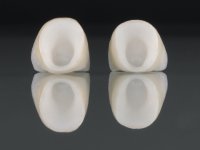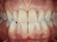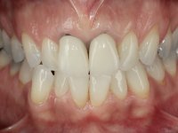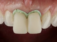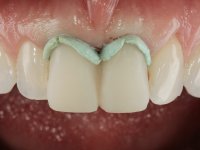 O tratamento iniciou-se com a confeção de moldeiras transparentes em silicone para aplicação de peróxido de carbamida a 16%. Os espaçadores colocados na superfície vestibular foram cuidadosamente preparados em resina nos modelos de gesso. O tratamento foi feito aplicando o produto 2 horas por dia durante 8 dias. Após o branqueamento esperamos 4 semanas e iniciamos o tratamento prostodôntico. Foi realizada uma pré-impressão em silicone para confeção de uma ponte provisória com resina composta de polimerização dual. Em seguida iniciamos a remoção das coroas. Foi feito um corte vertical na zona média da coroa até encontrar a superfície do espigão falso coto fundido. No bordo incisal também foi realizado o mesmo corte. Em seguida com um luxador fino foi feita a separação das partes distais das coroas. Para a remoção das partes mesiais foi feito um corte na linha média abrangendo ambas as coroas. No final da remoção atraumática das coroas antigas os cotos foram re -preparados. Na re-preparação dos cotos a linha de acabamento foi colocada a nível intra-sulcular. Na mesma consulta foi feita a impressão definitiva. O afastamento gengival foi realizado com a técnica da pasta de caolino comprimida pela ponte provisória. A impressão foi feita pela técnica de dupla mistura com dupla viscosidade com silicone de presa rápida. No laboratório foram confecionadas 2 coroas com infraestrutura em Zr sendo revestidas a cerâmica. No sentido de evitar aparência de coroas “muito altas” foi aumentado ligeiramente o diâmetro mesio-distal sobrepondo-se ligeiramente aos dentes adjacentes. A ponte provisória foi removida os cotos foram polidos e as coroas foram colocadas para verificação final. Confirmado o seu ajuste e aprovadas pela paciente foram cimentadas definitivamente com cimento de ionómero de vidro reforçado com resina.