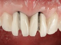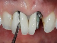 Paciente do sexo feminino com 41 anos de idade, não fumadora. Apresentava duas coroas sobre espigões falsos cotos fundidos nos dentes 1.1 e 2.1. As coroas apresentavam-se com infiltrações cervicais com exposição da superfície radicular. A papila gengival mediana, apresentava-se ligeiramente retraída. O espaço mesio-distal correspondente às duas coroas mostrava-se alto e estreito. Apresentava um ligeiro apinhamento dos incisivos inferiores, bem como uma pequena retração gengival. No sorriso era bem visível a zona cervical das coroas, mostrando um aspeto acinzentado correspondendo ao escurecimento radicular. No exame imagiológico verificou-se que o tratamento endodôntico não estava tecnicamente satisfatório, mas assintomático à quase 10 anos.