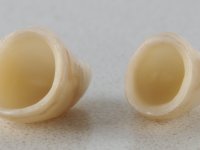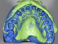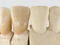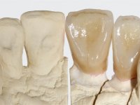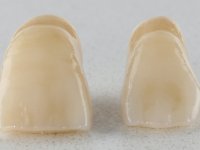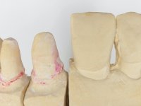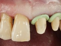 Foi feita uma pré-impressão em silicone para confeção de uma ponte provisória em resina composta de polimerização dual. A ponte metalo-cerâmica foi removida com cortes de turbina e micro luxadores. Após a remoção da ponte os cotos foram cuidadosamente re-preparados procurando manter a vitalidade dos dentes. As linhas de acabamento cervical foram colocadas a nível intra-sulcular. Os dentes pilares foram re-preparados para coroas porque o paralelismo exigido para a confeção de uma ponte exigia um maior desgaste da estrutura dentária. Imediatamente a seguir ao preparo dentário foi feito o selamento dentinário com a aplicação de adesivo. O afastamento gengival foi feito com a técnica do caolino pressionado pela ponte provisória. A impressão foi feita pela técnica de dupla mistura com dupla viscosidade e silicones de presa rápida. No laboratório foram confecionadas 2 coroas em Zr. Particular cuidado foi colocado na caracterização radicular procurando mimetizar as raízes dos dentes adjacentes. O trabalho definitivo foi colocado em boca verificando-se o ajuste e a aprovação por parte do paciente. A cimentação definitiva das coroas foi feita com cimento de ionómero de vidro reforçado com resina.