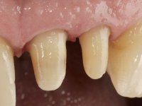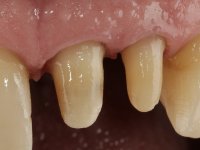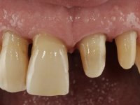 Paciente do sexo masculino com 64 anos de idade, não fumador. A ponte metalo-cerâmica de 2 elementos que reabilitava os dentes 2.1 e 2.2 apresentava as margens infiltradas e muito expostas. Os dentes pilares estavam vitais respondendo a estímulos térmicos. A ponte parece ter extruido aumentando ainda mais a sensação de discrepância entre o limite cervical dos pilares da ponte e os dentes adjacentes. Os dentes apresentam uma exposição radicular generalizada e a recessão gengival é manifesta. Os dentes tinham mobilidade. O fenótipo gengival é espesso e a higiene oral é sofrível.