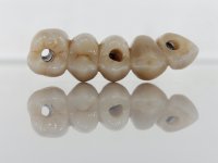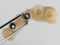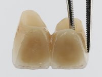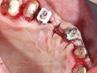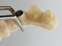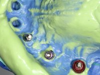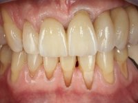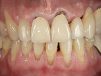 66-year-old male patient, non-smoker. It featured a 5-member metal-ceramic bridge with extreme mobility. Teeth 11 and 21 had infiltrated cervical margins. Both arches showed root exposure with signs of cervical abrasion. Composite resin “slots” were visible on the buccal surfaces of some mandibular teeth compatible with an orthodontic treatment with aligners that the patient was undergoing. After the imaging examination, it was found that the bridge's distal support, tooth 24, was irretrievably lost. The mesial pillars 11 and 21 had endodontic treatment and intraradicular posts. Teeth 25 and 26 also had endodontic treatment and extensive restorations in composite resin. In the lower jaw, two bridges were visible. In the third quadrant a 4-element bridge supported on tooth 35 and on 2 implants placed in the location of teeth 36 and 37. In the fourth quadrant a 3-element bridge supported on tooth 45 and an implant placed in the location of tooth 46. The patient presented a thick gingival phenotype and very good oral hygiene.