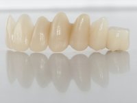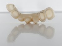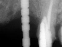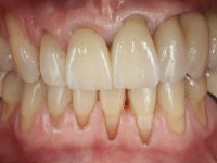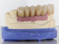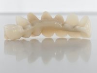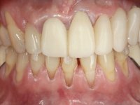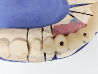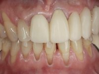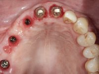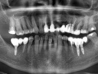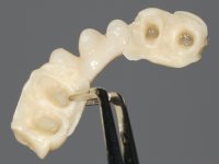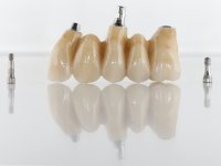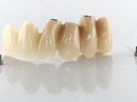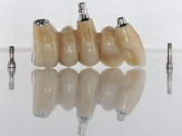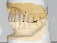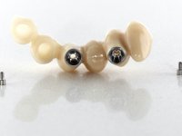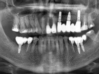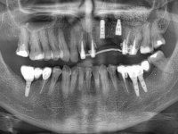 A temporary acrylic bridge made in the laboratory with 7 elements was made, with teeth 11,21, 25 and 26 as pillars. The old bridge was removed and tooth 24 was extracted. The provisional bridge after relining was cemented in the mouth. Two implants were placed in the teeth 22 and 24 and 3 months after this intervention an impression was made to make a temporary bridge screwed over the implants and cemented to the teeth. The bridge was placed in the mouth and teeth 25 and 26 were extracted. 3 months later, surgery was performed to fill the maxillary sinus and 6 months later the implant was placed in the location of tooth 26. After osseointegration of this implant, the final impression was made for the final work. The bridge over the implants was permanently screwed on and the bridge over the teeth was cemented with resin-reinforced glass ionomer cement.