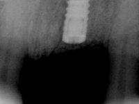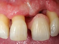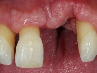 Male patient, 55 years old, smoker. Presented to our dental appointment with a dental implant placed in the area of tooth 21. The gingival architecture in the area lack interdental papilla and showed a vertical deficiency of the soft tissue. Adjacent teeth had significant root exposure.