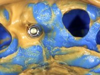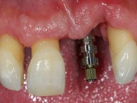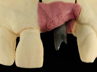 I’ve decided to rehabilitate the dental implant by closely mimetizing the crown and the root of the adjacent teeth, as well as the gingiva close to the soft tissue deformity. Thus, the prosthetic component would integrate three parts: crown, root and gingiva.