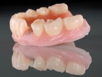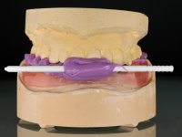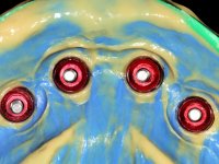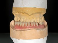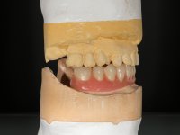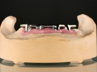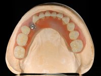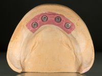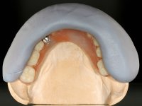 After 8 weeks of osseo-integration an impression was done with an open-tray, and a double-mixture technique (putty-soft and light). Then, the occlusal wax-rims were done on the working casts, with a denture base that had an implant transfer that allowed the screw of this base. In this way, denture base was “fixed” to a dental implant easing the intermaxillary registration.
