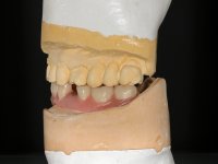 In the maxilla, patient presents two metal-ceramic 3-unit implant-supported bridges (16-14 ; 25-27). Tooth 13 had a root canal treatment and tooth 24 a class II OD restoration in composite. The periodontal status of the remaining teeth was satisfactory and patient presented a good oral hygiene.