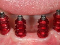 Implants placement was done. Guided by the treatment plan, the implantologist took special care on placing the implants: parallel to each other; well distributed all over the mandible; with their necks at the same height.