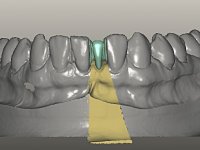 The deciduous tooth was extracted and a provisional resin crown with two small wings was bonded to the lingual surfaces of adjacent teeth. Two months later, the provisional crown was removed and the proximal walls were slightly prepared in order to parallelize the proximal walls and slight augment the mesio-distal space. After this minimal invasive dentistry, a dental impression was done with addition silicones in a one-stage technique. A provisional resin crown with an orthodontic wire on the buccal surface was then bonded to the adjacent teeth with resin, avoiding changing the prepared proximal and lingual surfaces.