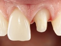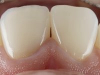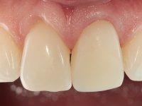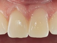 Female patient, 36, non-smoker. Tooth 2.1 presented endodontic treatment, and a chromatic alteration in the vestibular surface. The yellowish stain seemed to result from a change of depth in the enamel. Tooth 1.1 had a slight gingival retraction. Good hygiene and periodontal health.