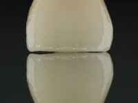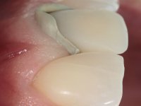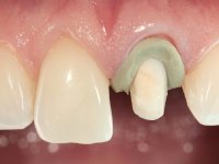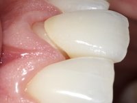 After preparation of a silicone pre-print, tooth preparation was conducted. When the veneer was prepared, it was verified that it was present in depth. Enamel shade guides were placed from a personalized shade guide with vaseline over the stain, to see if it could be eliminated with a veneer. This turned out not to provide an adequate solution. I made the decision to move to a full-length restoration, a crown. Immediately after dental preparation for the crown, a temporary restoration was made in composite resin by the pre-printing method. The provisional was used to compress a kaolin paste and to perform gingival retraction. An impression was made using wash technique Impression. In the laboratory, a crown with ceramic-coated Zr infrastructure was prepared. In the mouth, for aesthetic reasons, the distal surface was corrected with dental polishing discs and adequate dental rubber polishing points. The work was approved by the patient, and definitive cementation was performed with resin reinforced glass ionomer.