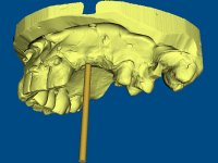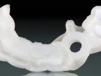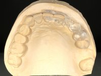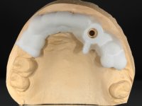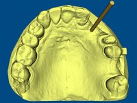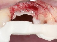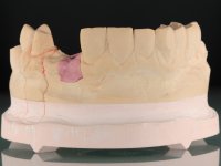 After clinical and imaging evaluation, it was decided not to remove the fractured implant, but to submerge it. Explantation of the implant would cause a deformity difficult to rehabilitate. Thus, it was decided to place an implant at the site of tooth 2.2 and later perform rehabilitation with a 3-units metallic ceramic bridge. Virtual planning of implant placement as well as the confection of a surgical guide would be mandatory for its correct positioning. A ceramic bridge with coronary and gingival shade would be screwed to the implant, and cemented in tooth 2.4, with 2.3 as pontic. Temporization would be made with a 3-elements provisional bridge, cemented to tooth 2.4 and bonded with a metallic support to tooth 2.1.