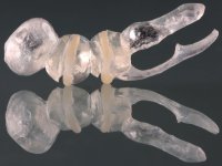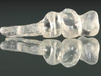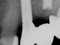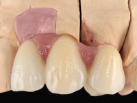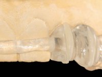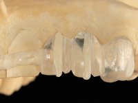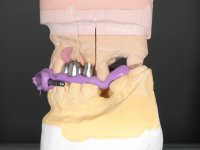 Once the diagnosis was made, a temporary acrylic bridge with reinforcement was created in the laboratory. The 3-unit bridge would use tooth 2.4 as abutment, have teeth 2.3 and 2.2 as pontics, and would have palatine support from tooth 1.1. After removal of the bridge over the implant, tooth 2.4 was prepared and the bridge relined on-mouth with acrylic. Before installation of the provisional bridge, an impression was made for confection of an imagiologic guide. In the following session, a CT Scan was performed with the imagiologic guide. The virtual planning of implant placement at the site of tooth 2.2 gave rise to a surgical guide. Placement of the implant was done with the guided surgery technique, complemented with guided bone regeneration. The fractured implant was cut with the objective of submerging it. In the following 3 months, osseointegration of the implant was achieved, as well as complete maturation of the hard and soft tissues. During this period, the patient used a fixed provisional bridge. The impression of the implant and the prepared tooth was made using the open tray impression technique. The working model cast was performed with artificial gingiva, and on it was constructed a 3-units metal framework, to be cemented on tooth 2.4 and screwed on the implant placed at the site of the tooth 2.2. Infrastructure test was done by clinical and imaging validation. In this consultation, the intention to use coronary and gingival ceramic was confirmed, and color was selected using individualized color guides. With the infrastructure placed in the mouth, I performed a new intermaxillary registration with silicone, to confirm the previous registration. Coronary and gingival ceramic were placed covering the infrastructure, and with the finished work, before its placement, its integration in the mouth was again verified. Fixation was done with cementation on tooth 2.4, and screwed onto the implant. Finally, its occlusal integration was rigorously evaluated.