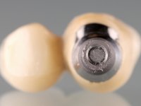 60-year-old female patient, non-smoker. Patient appeared for consultation presenting mobility on a screwed metallic ceramic bridge over an implant, in place of tooth 2.3. Imaging examination revealed a bone-level fracture on the implant. Adjacent soft tissues were inflamed and hemorrhagic. Patient had parafunctional habits and showed satisfactory oral hygiene.