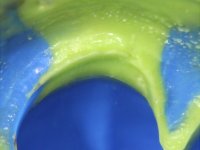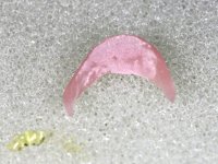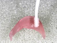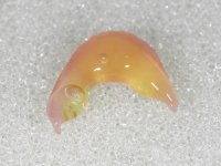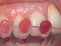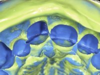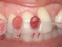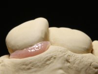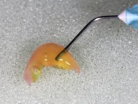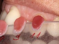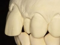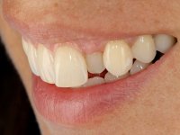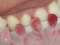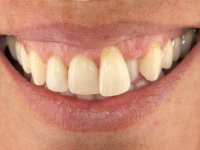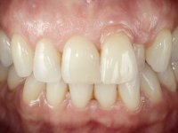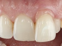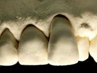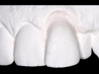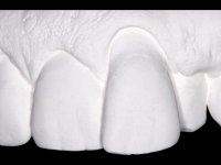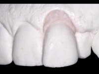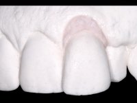 After insertion of a gingival retraction cord, tooth preparation was performed to eliminate retentive zones. Immediate dentin sealing was done immediately after tooth preparation. An impression was made using wash technique Impression, with putty soft silicone and light silicone, both fast set. A gingiva shade ceramic guide was used. The collection of gingiva shade information was done by the ceramist, with a personalized shade guide. In the lab, a refractory cast working model was prepared, and a gingiva shade, feldsphatic ceramic veneer was made. The thickness of the prosthetic piece proved very difficult to reduce as much as we would like to. The insertion axis also introduced some difficulty, but this was easier to get around. Once the work was approved by the patient, definitive bonding with translucid composite resin was performed. Resin remains were carefully removed with a scalpel blade, and the dental surface was polished with dental polishing discs and suitable dental rubber polishing points.