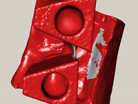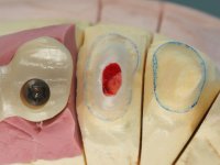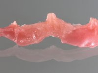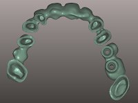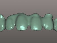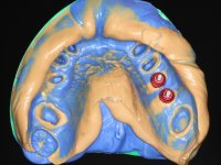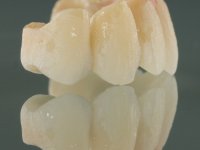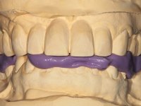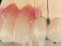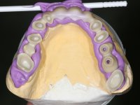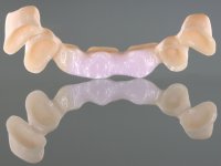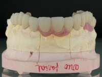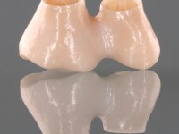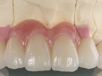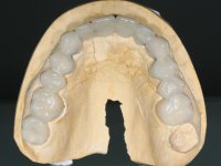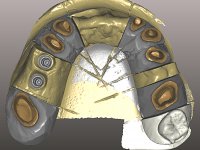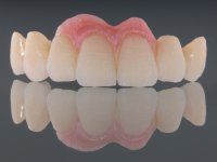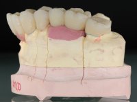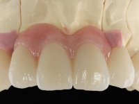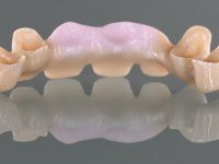 Alginate impressions were made at both arches arcades, accompanied by intermaxillary registration relations and collecting information with facial bow facial bow. In the laboratory, a provisional bridge with 13 elements in autopolymerizable acrylic was built, in which a metallic reinforcement was included. Teeth 1.7 / 1.4 / 1.3 / 2.2 / 2.3 / 2.4 and 2.6 were used as pillars. The metal-ceramic bridge was removed after performing longitudinal cuts with diamond burs. The dental abutments were reprepared and the temporary bridge was relined in the mouth with self-curing acrylic. After confection of the provisional bridge, a gingival epithesis was made using composite resin with gingival tonality in order to function as a mock-up, which allowed the patient to preview the possibility of using gingiva shade ceramics in the final work. This option was approved by the patient. Subsequently, the placement of two implants in the first quadrant was planned and executed. The provisional monoblock was removed for placement of the implants, and after surgery was again cemented provisionally. After the osseointegration period, the impressions were made to the maxilla. In the anterior zone, impregnated gingival retraction cords were used, and in the posterior areas, kaolin paste was used. Implant printing utilized the open tray technique. The printing material used was soft and regular putty addition silicone, both fast-setting. In the laboratory, the model of provisional restorations and the gingiva epithesis mock-up served as orientation for waxing the infrastructure. The plaster work model and the waxing of the infrastructure were placed in a laboratory scanner and yielded a digital work model, in which the scanning of the waxed infrastructure was superimposed. This overlay facilitated the CAD design of the Zr infrastructure. Subsequently, the CAD drawing for a CAM milling process provided the Zr pieces. The infrastructure was pigmented with a pinkish coloration, which favors the subsequent placement of gum shade ceramic. During the modeling of the infrastructure, the need to increase the occlusal wear on tooth 1.4 was detected. This was done in the real working model cast and an acrylic wear control guide was created, which accompanied the proof of the infrastructures. Corrective wear and Zr parts test were performed in mouth. During the test, the color choice of the gum shade ceramic was reassessed. The treatment was finished in the laboratory, and after approval by the patient, was definitively placed in the mouth.