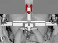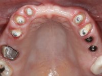 Female patient, 43 years old non-smoker. After a clinical and imaging examination, the patient presented teeth 1.7 / 1.4 / 1.3 / 2.2 / 2.3 / 2.4 / 2.6 with endodontic treatment in the upper jaw, showing absence of teeth 1.6 / 1.5 / 1.2 / 1.1 /2.1 and 2.5, and was rehabilitated with a 10-element monobloc metal-ceramic bridge. The anterior maxilla presented extensive vertical and vestibular bone reabsorption. In the lower jaw, two implants were placed at the site of teeth 4.6 and 4.5 rehabilitated with a metal-ceramic bridge. Teeth 3.6 and 3.7, with endodontic treatment, were rehabilitated with intra-radicular posts and a two-element metal-ceramic bridge. The antero-inferior teeth presented class III and IV resin restorations. Tooth 3.5 was absent. The patient had a vertical dimension of occlusion reduction, accompanied by accentuated dental wear and some ceramic fractures. Good oral hygiene.