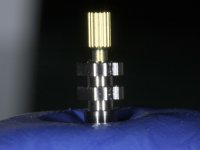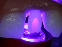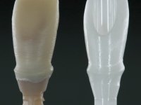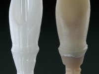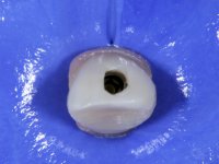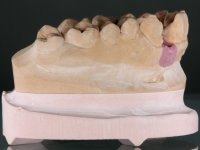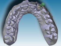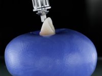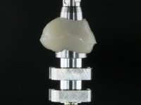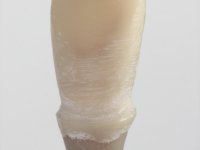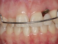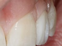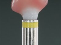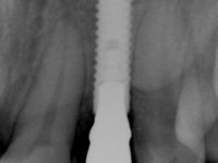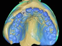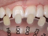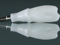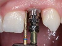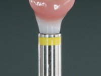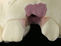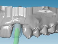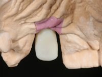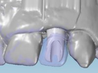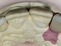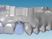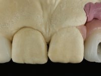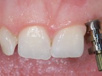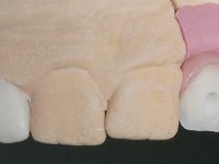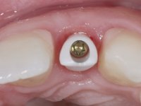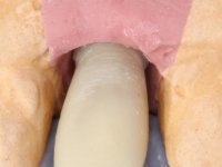 Before the treatment plan was elaborated, the patient was made aware of the inherent technical difficulty in aesthetical rehabilitation of the implant. After a long exchange of opinions with the dental technician, an unconventional treatment plan was presented, whose purpose was to minimize the aesthetic asymmetry between the left and right sides and between the cervical and incisal levels. The solution comprehended the realization of two veneers in composite resin of gingival tonality, to rehabilitate the interdental papillae of the edentulous space. A screwed abutment in Zr. with coronary and gingival component was planned for placement over the implant. As the implant angulation would put access to the screw on the vestibular face, confection of a feldspathic veneer was proposed, to be bonded to the abutment in order to camouflage the screw access hole. In tooth 1.2 a feldspathic veneer would be bonded, to correct microdontia and the small rotation.