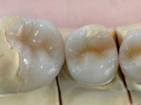 After it, the dental technician constructed the ceramic overlays to rehabilitate 47-44, that were bonded while testing the CAD-CAM zirconia frameworks in the maxilla. In this session, the provisional FPDs in the 1st and 2nd quadrant were removed separately to allow a bite-registration with the inter-maxillary relations that the patient supported with the provisional restorations, and colour was evaluated and registered.