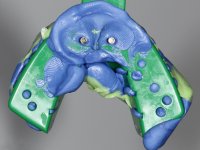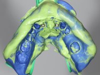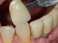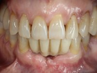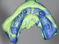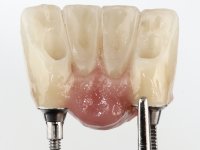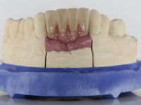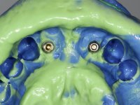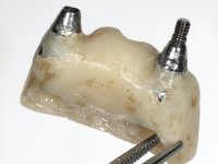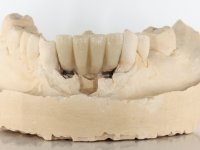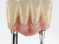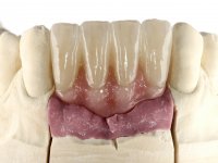 After an imaging study, the placement of two implants of 3.3 mm in diameter and 10 mm in length was planned. On the day of surgery, teeth 42 and 32 were extracted and the implant was removed. The implants were placed in the area of the alveoli, taking care to slightly lingualize their positioning. An impression was made using the open tray technique with the flap open for the fabrication of the immediate provisional bridge. While the impression was taken to the laboratory, tall healing screws were placed and the surgical wound was sutured. The patient waited 2 hours in the waiting room while the temporary bridge was made in the laboratory. An immediate screw-retained provisional bridge was placed and its seating was controlled by imaging. After 3 months, the final impression was made using an open tray technique. In this consultation, we took the opportunity to polish the temporary bridge with rubber cups so that the soft tissues could mature in better conditions. Information was collected to better characterize the monolithic structure in Zr. Color guides were used for the coronal and gingival ceramics. In the laboratory, a bridge was made in Zr. bolt-on that has been carefully characterized. After approval by the patient, it was definitively placed in the mouth. Tightening was performed with a dynamic wrench with a torque of 35 N. The holes were covered with Teflon and filled with composite resin.